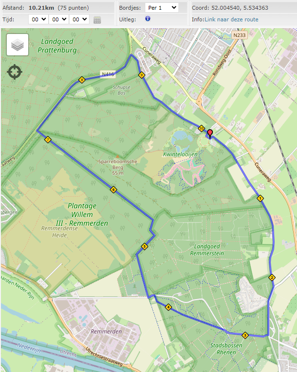 Hoewel er ook hardgelopen kan worden op de wandelpaden over het terrein en door het bos, is de uitgezette hardlooproute volledig verhard. Er wordt in feite om het recreatiegebied heen gelopen. De totale route is ruim 10 kilometer. Omdat de route volledig verhard is, is deze in principe ook geschikt voor rolstoelers. Er moet wel rekening mee worden gehouden dat de route de openbare weg en een aantal fietspadden volgt. Bovendien heeft de route een kleine 100 hoogte meters waar rekening mee gehouden moet worden. Hieronder staat een afbeelding van de route. De route is ook te downloaden als .gpx of als .kml bestand.